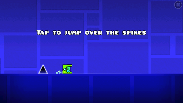 3、跳跃时不能碰到尖尖的三角形上面,但是可以停留在正方形上面,遇到这种障碍物比表密集的时候需要持续点击屏幕不要松手,等越过这些障碍物时及时松手即可。