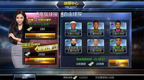 高级球探每46小时有一次免费招募次数,另外还可以花费球券进行十连抽,十连抽必得超级巨星及其它超值道具,同时享受9折优惠,高级球探里招募的球员可以直接获得,不用额外再花费球券签约。