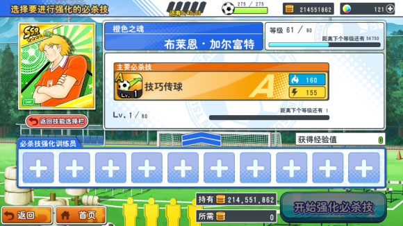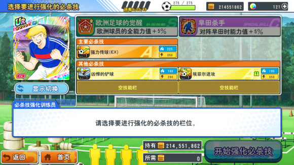 必杀技强化所消耗的金币数量和当前球员技能等级挂钩,1级技能强化所需要的金钱是最少的,有条件的话可以尽量用1级技能卡作为底卡去吃高等级的技能。