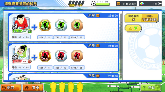 觉醒,能把球员提升级别。除特殊球员卡外,一般球员卡只能提升一个级别,N和R卡不能觉醒。SR和SSR卡分别吃满60和80级后可以进行觉醒,觉醒需要觉醒材料,觉醒材料主要获得途径是星期一至四的日常副本。球员觉醒是球队战力得到最大提升必不可少的阶段,至少先凑齐11个UR球员组成主力阵容吧。