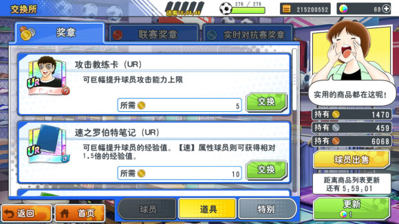 补给站里需要提一下的是奖章交换所。里面其中一项是用金银铜钱币兑换一些资源。每次出售或消耗掉球员卡玩家都会获得不同的钱币,出售宝箱球员只能获得铜币,不管是UR还是SSR。出售非宝箱的SR球员可以获得一枚金币,出售非宝箱的SSR球员可以获得15枚金币,UR球员则是30枚金币。