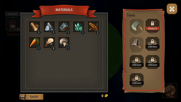 我们会逐渐带来大量的物品和材料,它们可以组合成车间,以获得新的工具、材料衍生物(如面料、玻璃瓶或锻造金属)、美食,甚至神奇药水。我们的家园将从一个帐篷变为一座大房子,带有锻造设施、厨房和实验室。能够建造多少物品呢?
