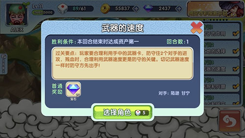 过关要点:玩家要合理利用手中的武器卡,防守住2个对手的进攻,残血时,合理利用武器速度更是防守的关键。切记武器速度一样时防守方先出手!