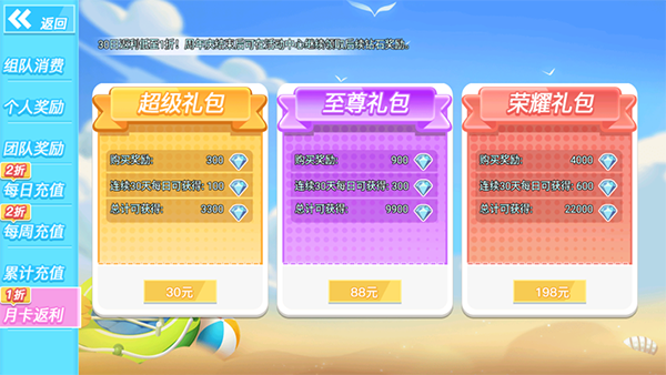 在活动期间月卡充值折扣低于1折!购买礼包后可获得购买奖励,还能连续30天每日获得绑定钻石,而且不同种类礼包可以同时购买。要注意同一种礼包叠加购买只会累计时长,不能重复领取每日奖励哦~