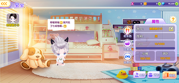 宝宝在室内时粑粑/麻麻可以对其进行吃东西、玩游戏、洗澡澡的操作;其中吃东西增加宝宝的经验值、玩游戏增加宝宝心情值、洗澡澡增加宝宝活力值。目前宝宝最高等级是5级。以后会开放宝宝更高等级,解锁更多玩法哦~