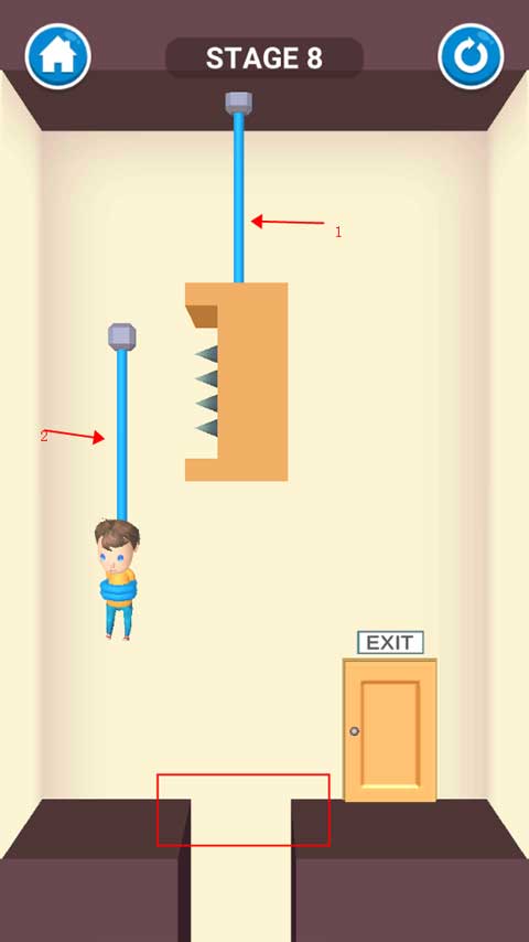 这关卡只是简单的用手指划过吊起小男孩的绳子,小男孩被解救之后就会自动走到出口,关卡通过。