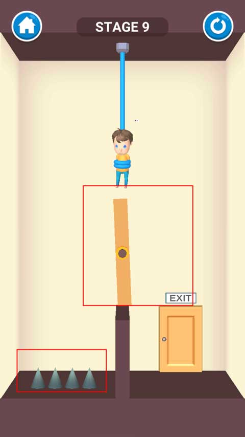 这次是将尖刺和滚轮结合,滚轮会进行左右滑动,玩家等待小男孩移动到左边位置时剪断绳子救他。
