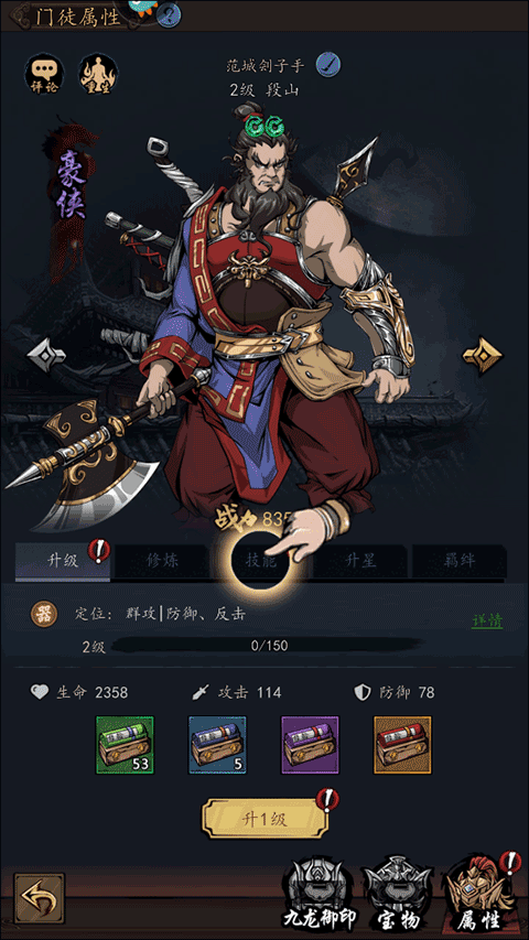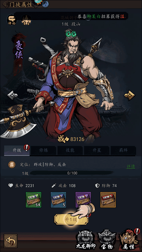 6、在门徒属性界面选择并点击“升1级”的选项,对其进行培养;