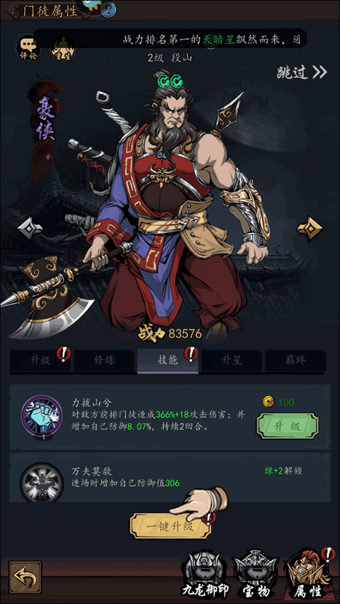 8、在技能界面选择并点击“一键升级”的选项即可完成对武人的升级。