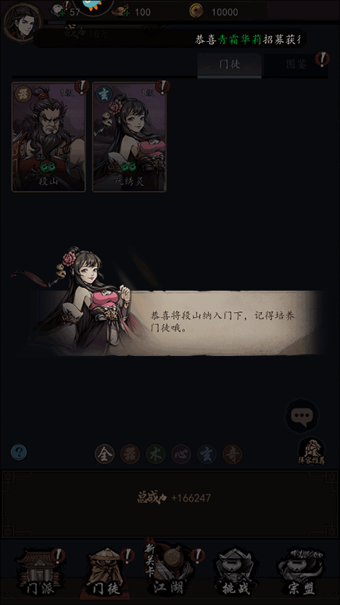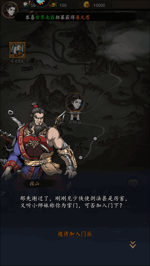 1、运行游戏后,在战斗结束后,主角将会招募第一名武士加入自己的队伍,在这里选择并点击“邀请加入门派”的选项;