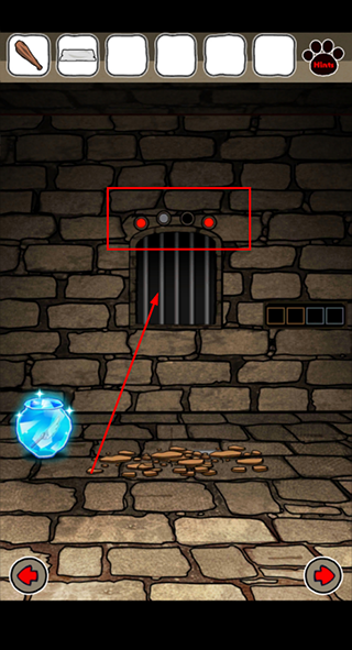 6、点击恶魔天平后石板输入红、灰、黑、红,开启石板获得黄色宝石,提示为铁栏杆房间栏杆上方宝石颜色