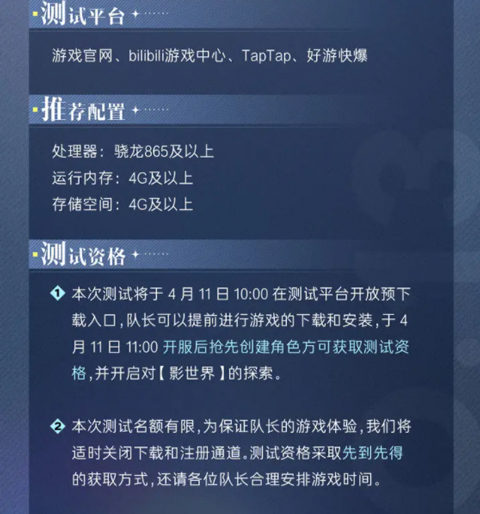 测试平台:游戏官网、bilibili游戏中心、TapTap、好游快爆
