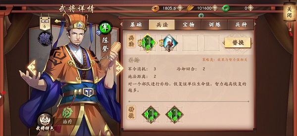 为什么大家同样都能使用【补给】兵法,陈登的补给力度就能这么强大呢?不妨一起来看看陈登专属武将特技吧!陈登的特技【援助】,能够让【补给】冷却时间-2,从而加快兵法的冷却回复。而另一特技【医术】还能够让【补给】的恢复效果+45%,大大提升回血量。那么主公们认为,陈登会是《策魂三国》中治疗量最高的军师吗?
