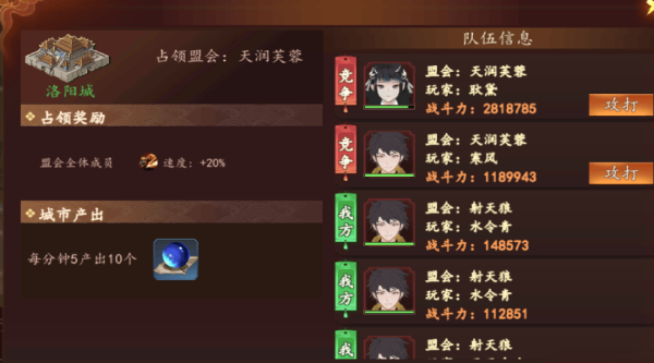 5、当已有被其他盟会占领的城池,自己盟会可以攻击对方盟会成员驻扎的队伍,也可以攻击正在攻击该城池的其他盟会,当一个城池的队伍列表都是我们盟会的队伍时,可成功攻占该城池,占领城池全盟成员都可以获得对应的战斗增益