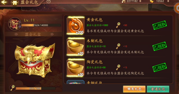 当盟会成员进行充值,购买礼包,完成盟会活动等行为,所有成员都可以获得一份奖励,奖励可以增加盟会礼盒经验和钥匙点数,礼盒经验可以升级礼盒等级,钥匙点数可以用来开启盟会礼盒,当钥匙点数收集满后所有盟会成员可以打开礼盒获得丰富奖励,礼盒等级越高,开启的奖励就越丰富,盟会礼盒可以累计,累计多个后可以依次领取所有礼盒奖励。