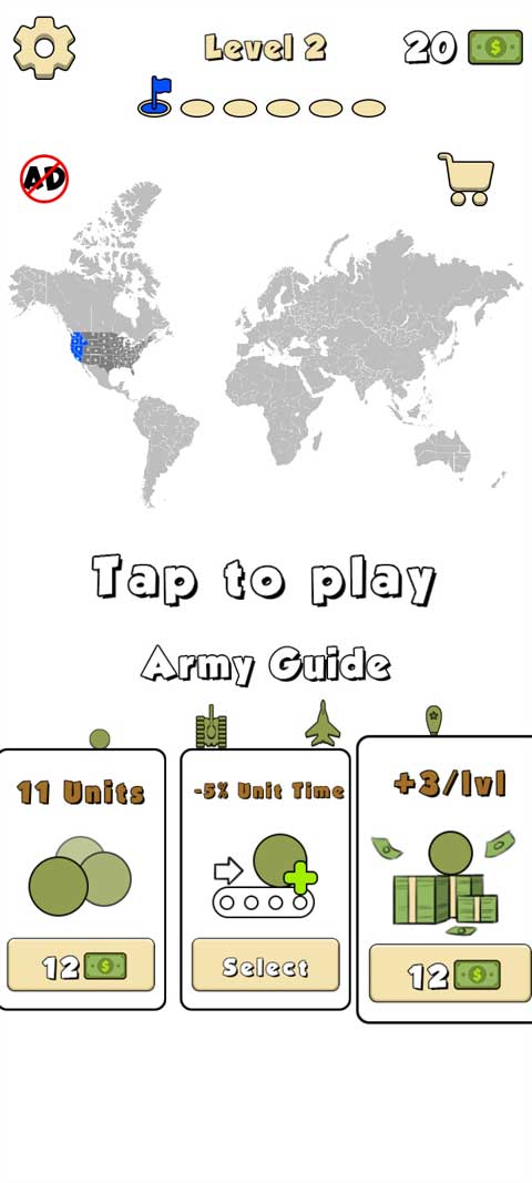 世界征服者手游官方正版又叫国家战争,是一款非常好玩的战争策略手游。玩家将扮演蓝色国家的角色,与其他想要占领你的土地的国家发生冲突。 您将拥有许多武器供您使用,例如部队、坦克、飞机和炸弹,以实现您征服世界的壮举。为了征服所有国家,你需要结合你的战略解谜技巧以及你的时机和反应,带领你的军队取得胜利,将世界变成蓝色!游戏的玩法非常简单,玩家作为蓝队通过生产的坦克或者士兵数量,侵占其他区域,越多后面国家越多,你需要做的就是发挥你的策略才能,将所有国家全部占领,这样就能获得胜利,赢得钞票!
