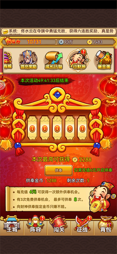 3、抢神将的活动没有10W金币别去做死,特别是第1次神将活动基本都会疯抢,等后面那些人都没金币了,第2第3次,你可能花1-2W金币就可以抢到神将。并且你的金币还是花不完(前提条件是你财神做完还是有6-8W金币)