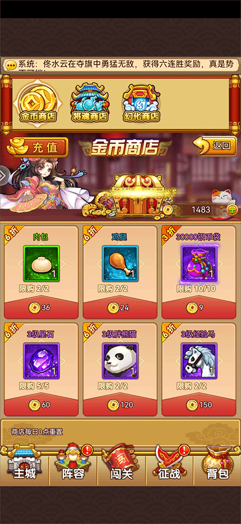 8、神秘商人,买银币,箱子,钥匙,将魂,武将升星材料,装备升星材料都是划算的。这些前期能买就尽量买吧