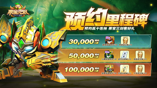 预约人数达成5W:《果宝特攻》4代-超品小果战宝碎片*30,金币召唤券*10,快速战斗券*10