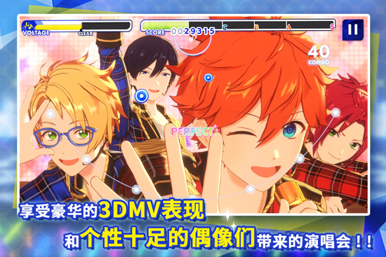 1、【与他近在咫尺,体验超真实的3DLIVE】玩家可以在这个模式中以超真实3D角色的演唱会场景为背景,体验节奏音游,