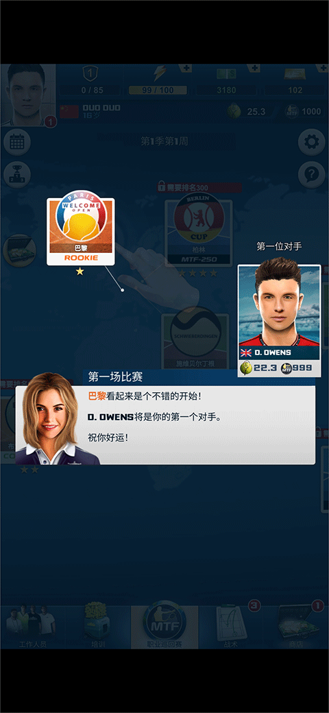 3、有了教练后,你就可以进行网球训练来提升水平,只有更高的网球水平才能有更大机会获得比赛的胜利