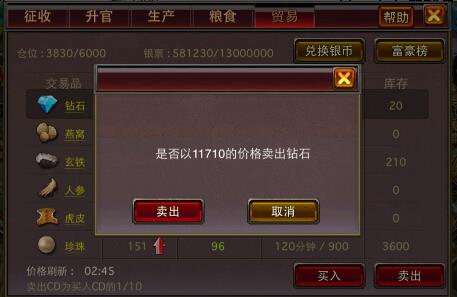首先贸易功能在账房升到61后出现,商品有:钻石:价格区间800-6500,买入 CD20分钟 /交易量5个