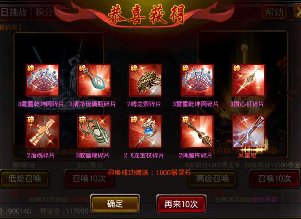 每日挑战中每天能获取积分,特别是挑战十的武将,打的伤害越高,积分奖励越多。积分可以用来兑换神器,如果弄红色神器。基本上三天的积分就够在积分兑换里搞一个红色神器,紫色神器的话每次召唤需要在500积分的基础上再增加300寻宝令,红色的只需要积分足矣,下面是500积分低级召唤的截图(免费的) 。