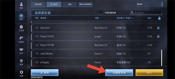 2、然后选择多人游戏,可以选择加入别人的房间,也可以选择创建服务器房间。