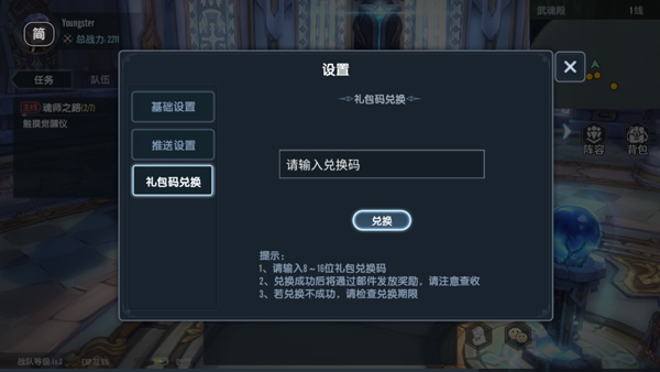 2、然后点击前往设置,点击礼包码兑换,输入兑换码点击兑换即可。