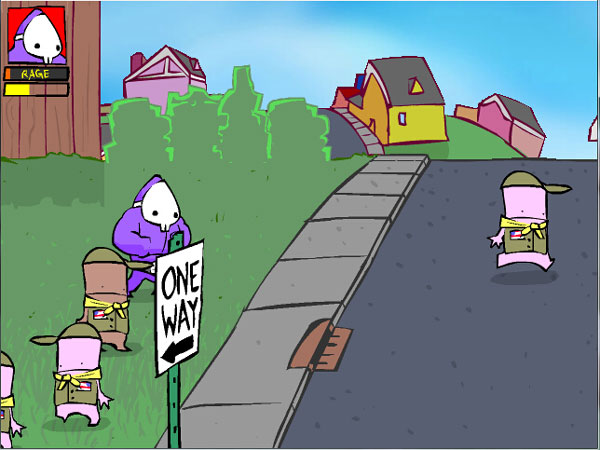 进入游戏玩家可以按方向键进行移动,移动时攻击可以造成飞扑的效果,战斗的时候会产生连击数,连击数越高获得怒气值也越快,当怒气值达到一定的程度后玩家进入暴怒状态,在暴怒的一瞬间,天空会降雷电那些熊孩子,并且在一定时间内,玩家的攻击附带雷电效果,同时可以借助一些道具如煤气罐等等,不过要小心炸伤自己。