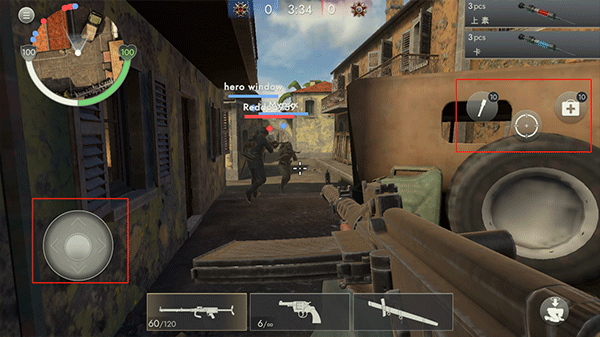 3、二战前线1942游戏开始后,左下角遥感操控角色的移动,右边控制方向、射击、治疗、等操作
