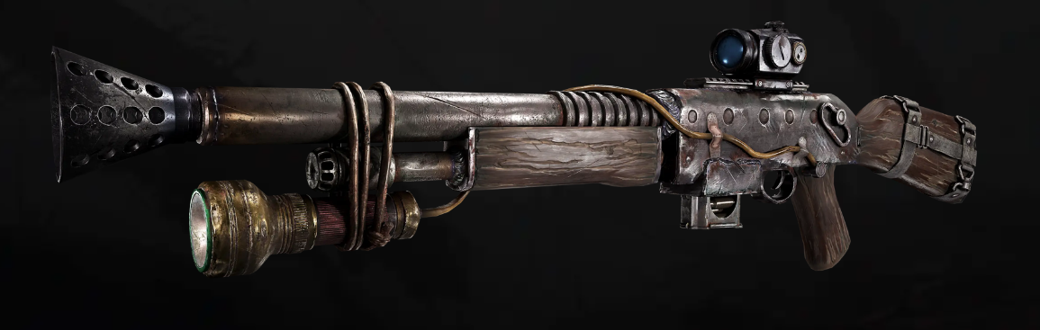 猎人们用各种零件拼接而成武器,但是却出奇的耐用结实,金属加固的枪身和厚重的金属枪管让其在任何恶劣环境下战斗都不会发生问题,巨大的喇叭口枪口发射时产生的无比巨大的声音对动物带来震慑力,让其呆立原地不敢逃跑