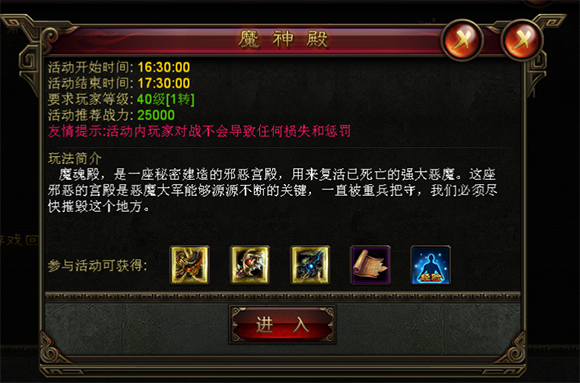 魔神殿,是一座秘密建造的邪恶宫殿,用来复活已死亡的强大恶魔。这座邪恶的宫殿是恶魔大军能够源源不断的关键,一直被重兵把守,我们必须尽快摧毁这个地方。活动开启时间:每天16:30—17:30