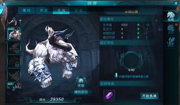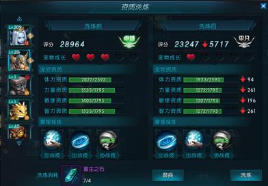 该界面玩家可以对宠物进行洗炼操作,洗炼消耗重生之石,不同资质的宠物需要的石头数量不一致。洗炼可以重置宠物的资质、成长甚至技能,而且可能会变高可能会降低,随机性比较强。