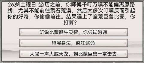 在游戏的过程中,每一个选择都是机遇与风险并存的。举个例子,出门游历前师父多次叮嘱不能去裂石荒漠,结果自己还是到了,碰到了蛮荒巨兽比蒙。这时候出现了三个选择,和它交流、逃跑或者是跟它硬刚。