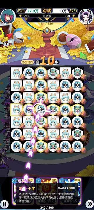 2、然后通过多消连消,利用沙盘特性“奇点2”步数加到了12步,和开始的5步比起来,真是底气十足啊!同时激活了底部技能,我们就可以随时使用了。
