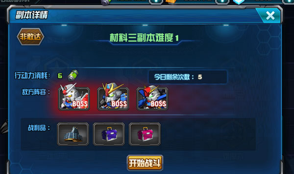 再来谈一谈机体装备升级材料,相信不少指挥官们和小编有过同样的遭遇,刷了大半管体力,却依然刷不到想要的材料!这时候小编就要推荐活动副本了!活动副本除了可以获得金币,经验外,还可以获得不同阶段的各种材料,指挥官们可以根据自己的需要来选择,但要注意的是每周七天开放的是不同的副本哦~需要打材料的指挥官们要密切注意相应材料副本的开放时间哦。