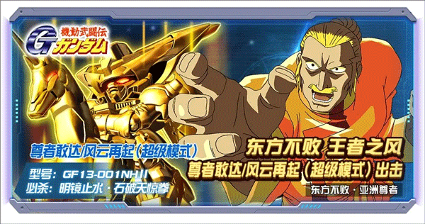 典藏新机尊者敢达/风云再起(超级模式)与典藏老牌机体神敢达/明镜止水同时上阵,师徒再度合作!两者技能之间拥有紧密联系,同时出场能发挥出最大实力。