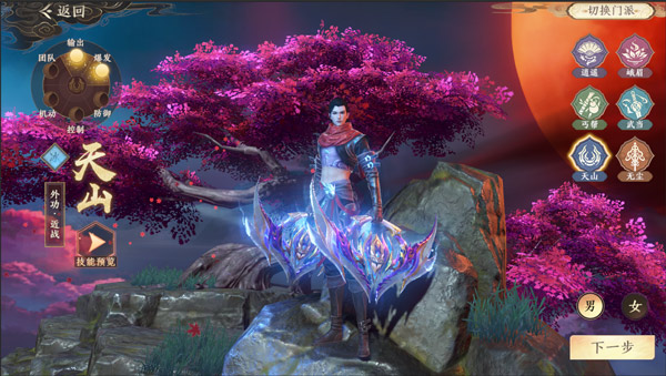天山属于近战输出门派,定位输出、爆发,武学提供了强势的【隐身】、【突进】能力,属于刺客类型的门派。喜欢身法灵活秒人于无形的玩家可选。