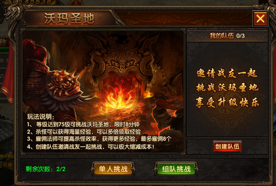每日完成2次沃玛圣地任务,可以快速获取海量经验,前往比奇城寻找npc【沃玛圣地】沃玛圣地分为单人和组队模式,组队模式人数限定3人,进入之后共享法神人数,能够极大的缩小任务的成本,享受战友一起游戏的快乐!