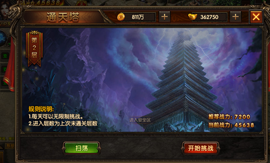 通天塔是技能书和技能符文的主要产出所在,也是对玩家硬实力最直接的验证,漫漫通天路,虽然艰辛,却可以让人充满成就感!通天塔的进入不限次数,战斗不够时,可以提升战力之后,再次挑战!首次通关会获得丰厚奖励!