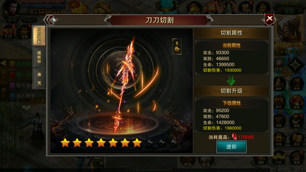 1、切割系统切割系统的作用很大,在前期多小伙伴们的帮助非常多,你的切割升级升的越高,切割伤害就越高,切割系统的伤害是在基础伤害上增加你的切割伤害,消耗魔晶即可进阶切割系统,魔晶的获得可以在商店使用钻石和元宝购买,每日可以购买一百次,当然了使用战功也是可以兑换魔晶的,战功的获得是在咱们游戏内的跨服活动英雄会内获取,每周三,周六的晚上19:00-19:40开放,大家可以通过这个时间段进行跨服活动获得军功来兑换魔晶用来圣级切割系统。