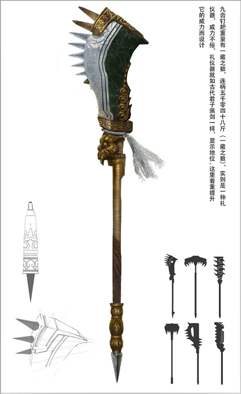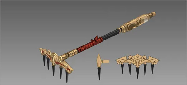 在参考了典籍又结合了大家对九齿钉耙的设定的理解设计出了天蓬元帅所持武器,威力巨大。