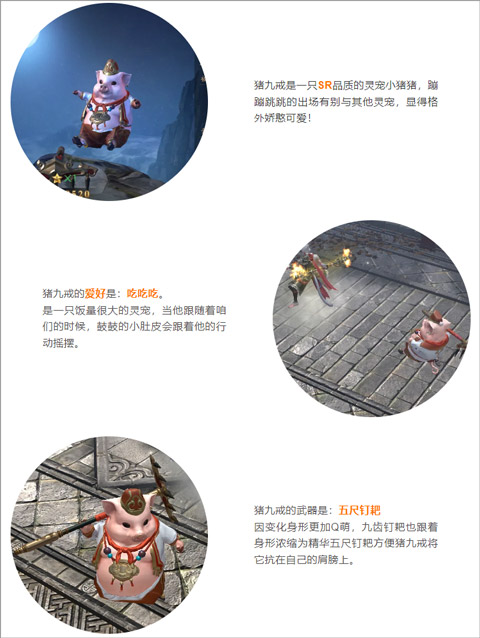 在设计猪九戒时更多是参考了西游对猪八戒的描写,但是为了做成可爱的灵宠跟着玩家重新塑造了他的形象。