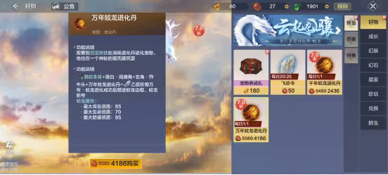 虽然前两周因为活动,蛟龙的进化丹非常优惠,但也有更享受培养过程想要自己合成进化丹的旅者,对于这些旅者也开放了千年蛟龙进化丹的制作配方,旅者可以使用8个摩奇翅、8个元子、8个雪龙元精、8个冰烜元神进行合成,这些材料分别来自巨兽-鬿雀、有限血蛋精华、巨兽千年雪鲸、巨兽-冰烜。