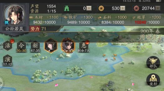 木材、铁矿、石料、粮草:游戏资源,用来升级建筑、征兵。