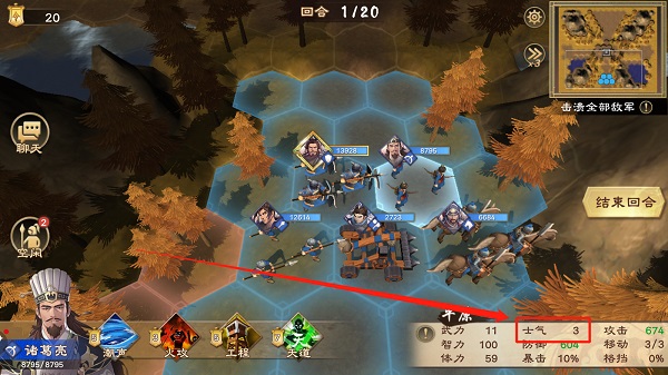 主公们在战斗中,每个部队起始士气值为3,每上升或下降1点士气值时,会影响10%的所有战斗属性,当武将的士气值不足3点时,每个回合都有一定的概率恢复到3。