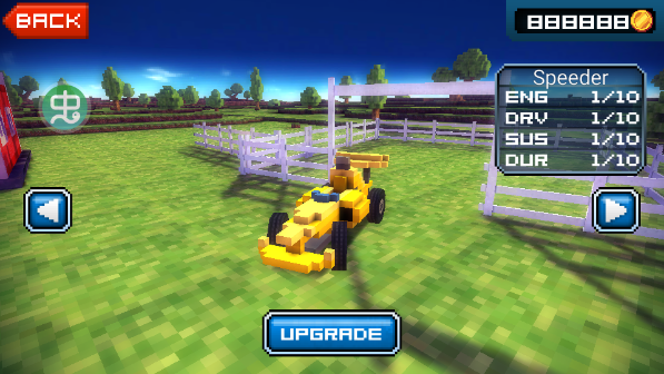 既然有《我的世界》的影子,那么也就少不了建造养成玩法了,之前收集到的宝箱里边不仅有金币,还有一些农场残骸,游戏结束后玩家可以进入自家园地进行重建工作。而在这里,游戏还允许玩家购买、升级赛车,同时还可以对车子的外观进行调整,上色的单位会细化到每一个像素颗粒,因此玩家的个性化体现完完全全能够办到。