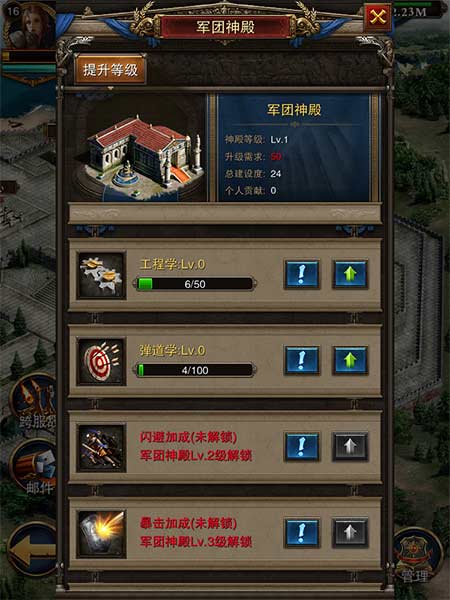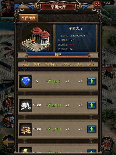 军团主建筑,通过捐献升级军团等级,军团其他建筑等级不能超过军团大厅,点击【捐献】可谓军团贡献资源,捐献越多军团的等级越高,能为军团成员提供更多的福利