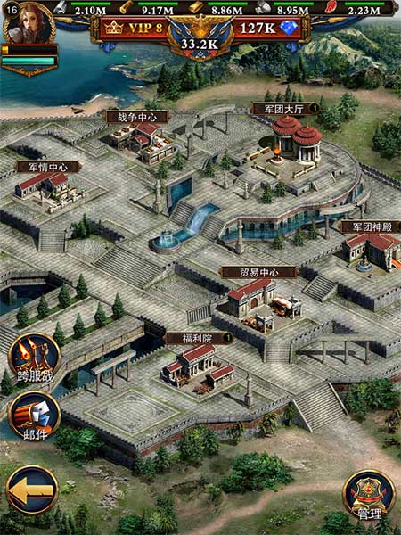 点击主城中的军团建筑,就能进入到军团内,可以看到军团的建筑,分别有军团大厅、战争中心、军情中心、贸易中心、福利院、军团神殿。